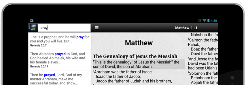 Searching the Bible has never been easier and more efffective. Simply search the Bible for a phrase or keyword and the search results instantly are displayed. This allows you to quickly access certain parts or themes that you may be in search for in the Bible.